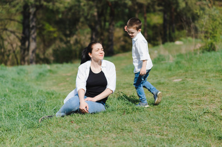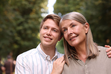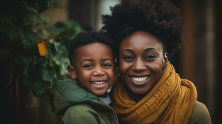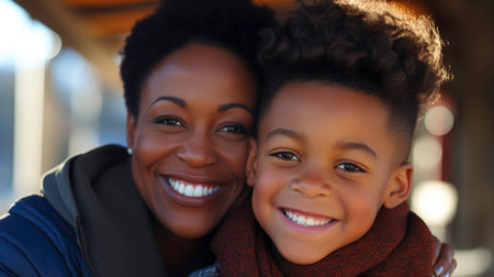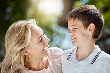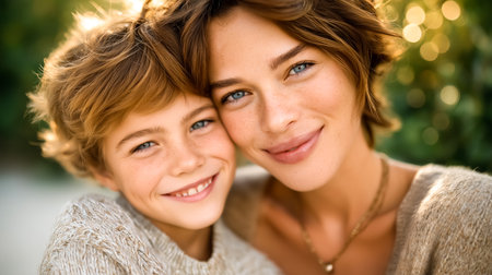 Mother and son smiling closely while enjoying outdoor moment. Soft blurred background enhances warm atmosphere. Concept of family connections, joy, portrait photography.