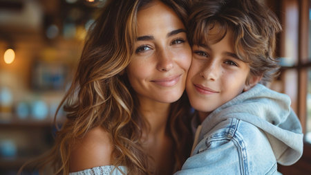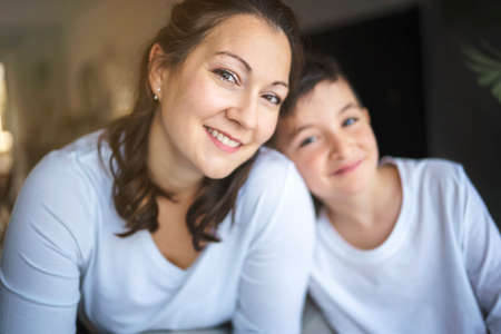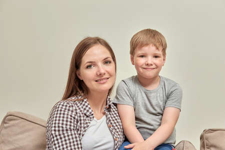 Young beautiful brunette mom hugs her son and looks at the camera. A happy family.