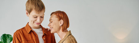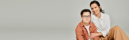 middle aged woman hugging son with down syndrome wearing eyeglasses on grey, banner, copy space