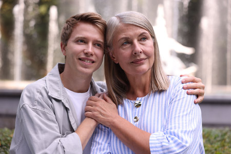 Head And Shoulders Portrait Of Smiling Mother And Son Hugging Outdoors
