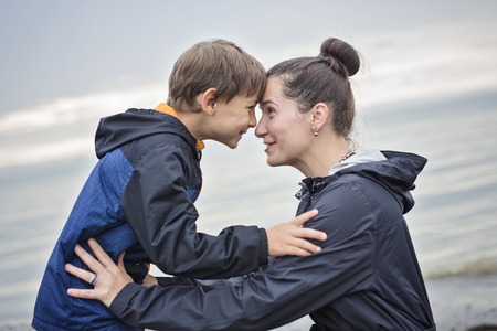 mom and son hug and look at each other. portrait of happy mother and son. winter walk along the street.