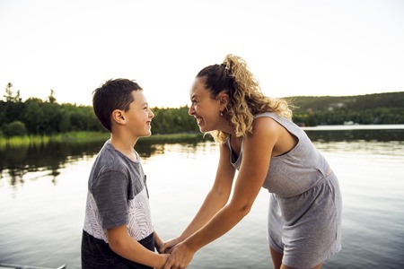 Mother and son share a joyful moment outdoors during sunset in a natural setting
