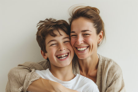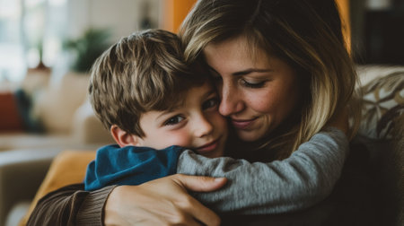 Mother and child are sharing a joyful moment, embracing each other with warm smiles, showing love and connection in a cozy environment.