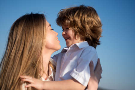 Mothers day concept. Child son hug mom. Mother and boy smiling and hugging. Family holiday and togetherness.
