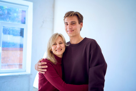 A young man and an older woman share a tender moment, highlighting their bond in a cozy indoor environment with soft lighting and warm atmosphere