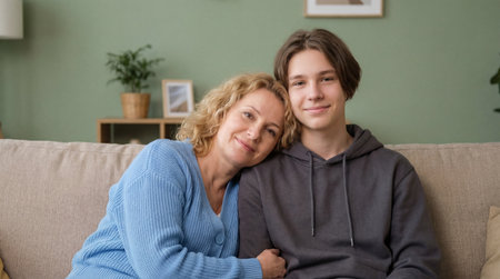 Smiling middle aged mother sitting on a cozy sofa with her teenage son, sharing a warm affectionate moment in a relaxed home setting.