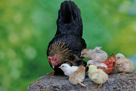 Closeup of a mother chicken with its baby chicks on the farm. Hen with baby chickens.