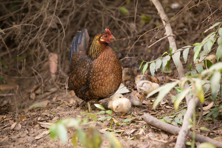 A mother hen keeping watch over her chicks as they peck at the ground for insects