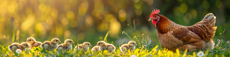 A vibrant rural scene with a mother hen leading her chicks on a sunny day, a heartwarming display of maternal care and guidance.