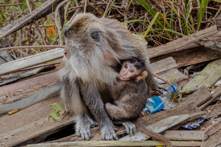 Protective Wild Monkey Embracing Its Infant Sitting Amongst Discarded Debris