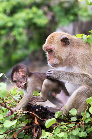 Monkey eating-crab macaque (long-tailed macaque) mother is feeding her baby in Koh Lanta island in the National Park, Thailand