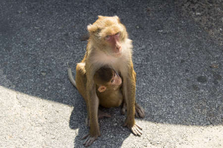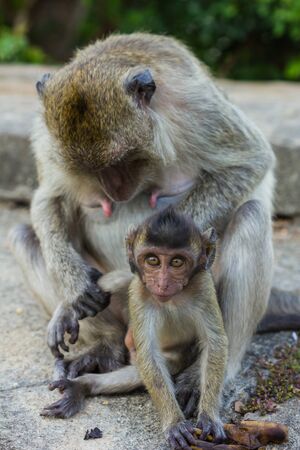 monkey mother and baby sitting on the ground in the forest, Thailand
