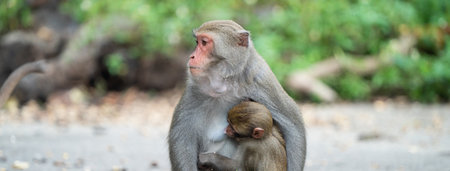 Wild monkey mom breastfeeding curious baby ape in their natural habitat.