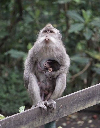 Monkey mother with her baby in Pusuk park, North Lombok, Indonesia
