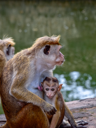 Monkey cub feeding on its mother's breast. Look towards the photographer. Monkey mom with son puppy. Bonnet macaque monkeys. Location: Myanmar