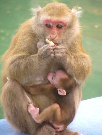 Portrait of adult female monkey with red face and baby during breast feeding.
