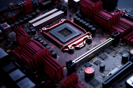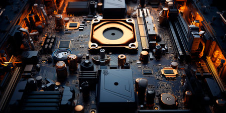 Computer motherboard closeup in tilt shift style. Computer equipment repair, assembly and upgrade of system units. Selective focus, defocused