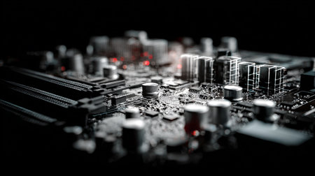 A detailed view of electronic components on a circuit board, illuminated by vibrant bokeh lights that evoke innovation and technological brilliance.