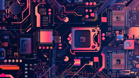 A close-up photograph of a colorful circuit board with integrated chips. The image is abstract and highlights the intricate details of the circuitry. The colors are vibrant and the lines are sharp, creating a striking visual effect.