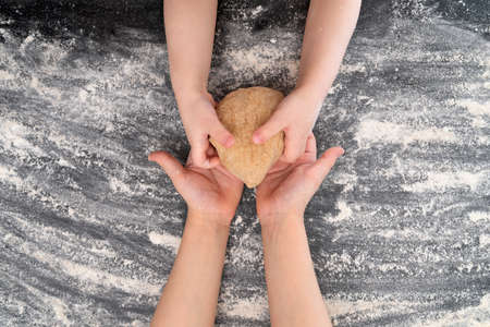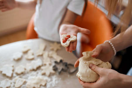 Hands of mother and child are with dough. Cooking cookies with children, spending time together