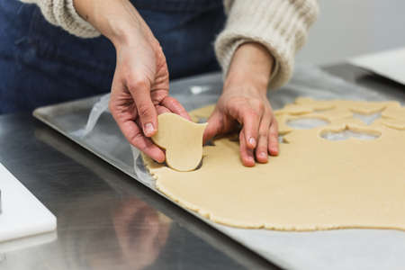 Confectioner cutting dough in the shape of a heart while making cookies in the kitchen of the bakery.