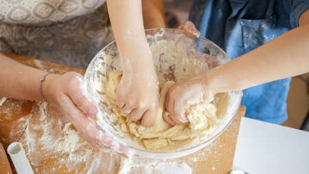 Close up image woman and little daughter knead dough with hands wooden table powdered with flour.