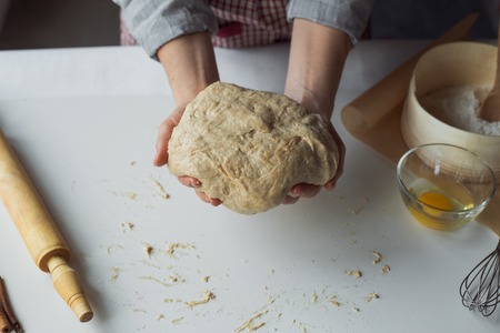 Women's hands kneading bread. Food background