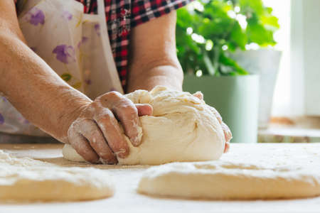 Cooking at home, old woman's hands kneading dough