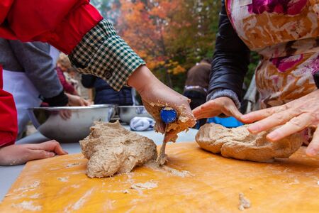 The hands of an old woman transmit bread dough to the small hands of a girl. The intergenerational connection.