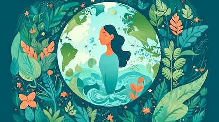 Mother Natures avatar, A girl adorned in green, embodying Earths guardian spirit against a lush backdrop a vibrant celebration for Earth Day