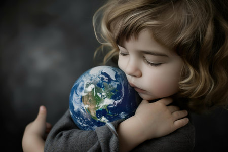 Tender moment as a young child tenderly hugs a globe, symbolizing hope and environmental awareness