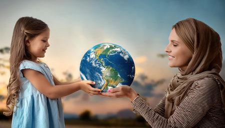 Muslim mother and daughter holding Earth planet on blurred nature background. save earth concept