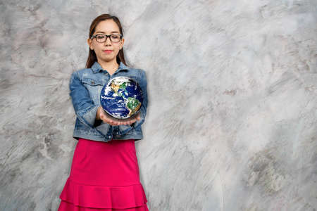 Discreet woman, standing in the palm of his hand, supports the bright blue world, and looks at the beauty of this world : Concrete background and Copy spaceElements of this image furnished by NASA