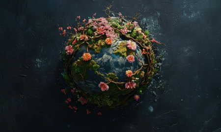A picturesque representation of Earth showcased amidst vibrant greenery and colorful flowers, symbolizing nature's beauty and ecological balance.