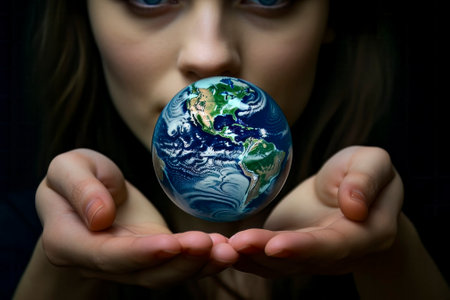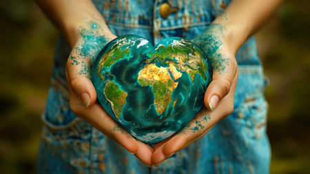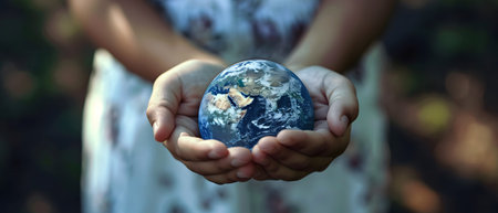 Two hands hold gently a detailed depiction of Earth, showing its blue oceans and green continents. Generative AI