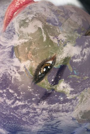 Save the earth -concept that the earth still alive and breathing ,woman face with world map looking up to the future
