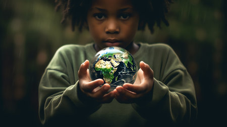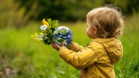 A young child holds a small globe adorned with vibrant leaves, embodying a deep connection to nature. This image promotes sustainability and environmental awareness.