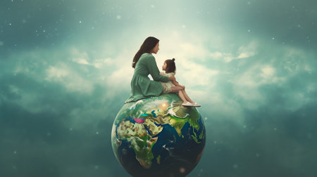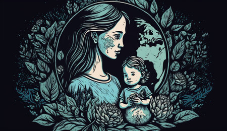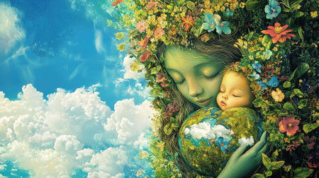 Mother earth embracing baby on world with flowers and sky, symbolizing love, nature, and environmental care. A vibrant illustration of hope and connection.