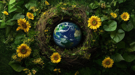 A captivating image featuring the Earth nestled within a beautiful arrangement of sunflowers and lush greenery, symbolizing nature's harmony and vitality.