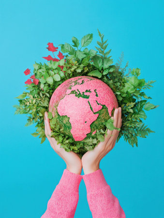 Hands holding a pink globe surrounded by greenery, symbolizing nature conservation and environmental awareness, with a vibrant blue background
