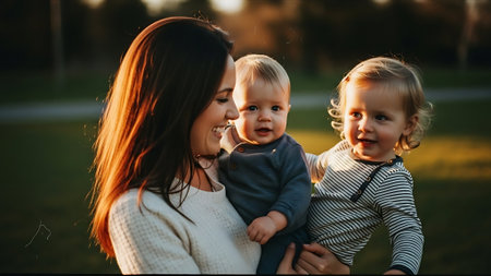 A woman holds a baby, their foreheads touching in a tender moment. The scene is illuminated by gentle natural light, creating a warm, intimate atmosphere. The composition emphasizes the connection between the mother and child. It is suitable for illustrating themes of family, love, and care. Potential applications include editorial and commercial projects.