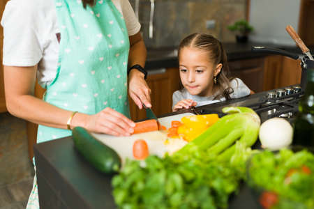 Close up of a cute little girl watching her mom chopping vegetables to prepare a delicious soup for lunch