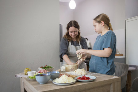 Lifestyle portrait of daughter cooking pizza with her mother in the kitchen