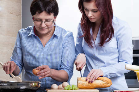 Cooking with mother. Happy good-looking mother attentively looking on hardworking daughter while she putting egg in bowl