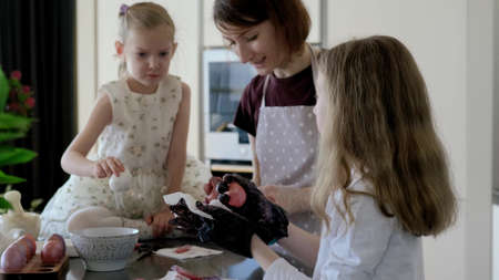Happy Easter. Mom and two cute daughters paint eggs for the traditional spring holiday at home