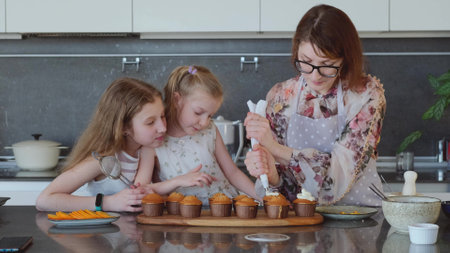 Two girls and mother are preparing cupcakes in the kitchen. Little daughter eats cream