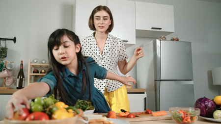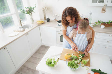 Smart caucasian mother and asian girl cooking together and chopping vegetable or preparing salad for dinner. Happy mom and daughter making healthy food with fresh food. Healthy food concept. Pedagogy.