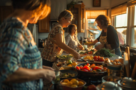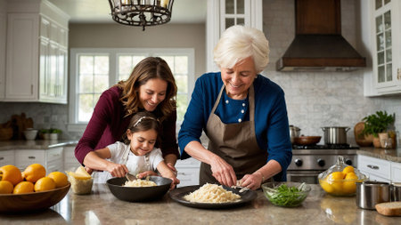 Baking together in kitchen, three generations sharing laughter and preparing ingredients. Family, bonding, cooking, multigenerational, home, tradition