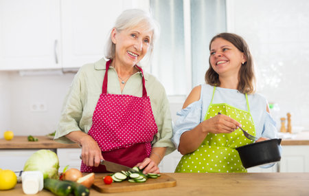 Senior asian mother and middle aged daughter cooking together at kitchen