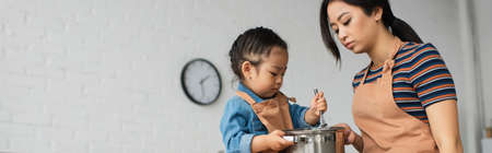 Pouring mother and daughter combining batter with measuring cup at home kitchen, aprons, copy space. Baking, cooking, women, duo, rustic, mixing, bowl
